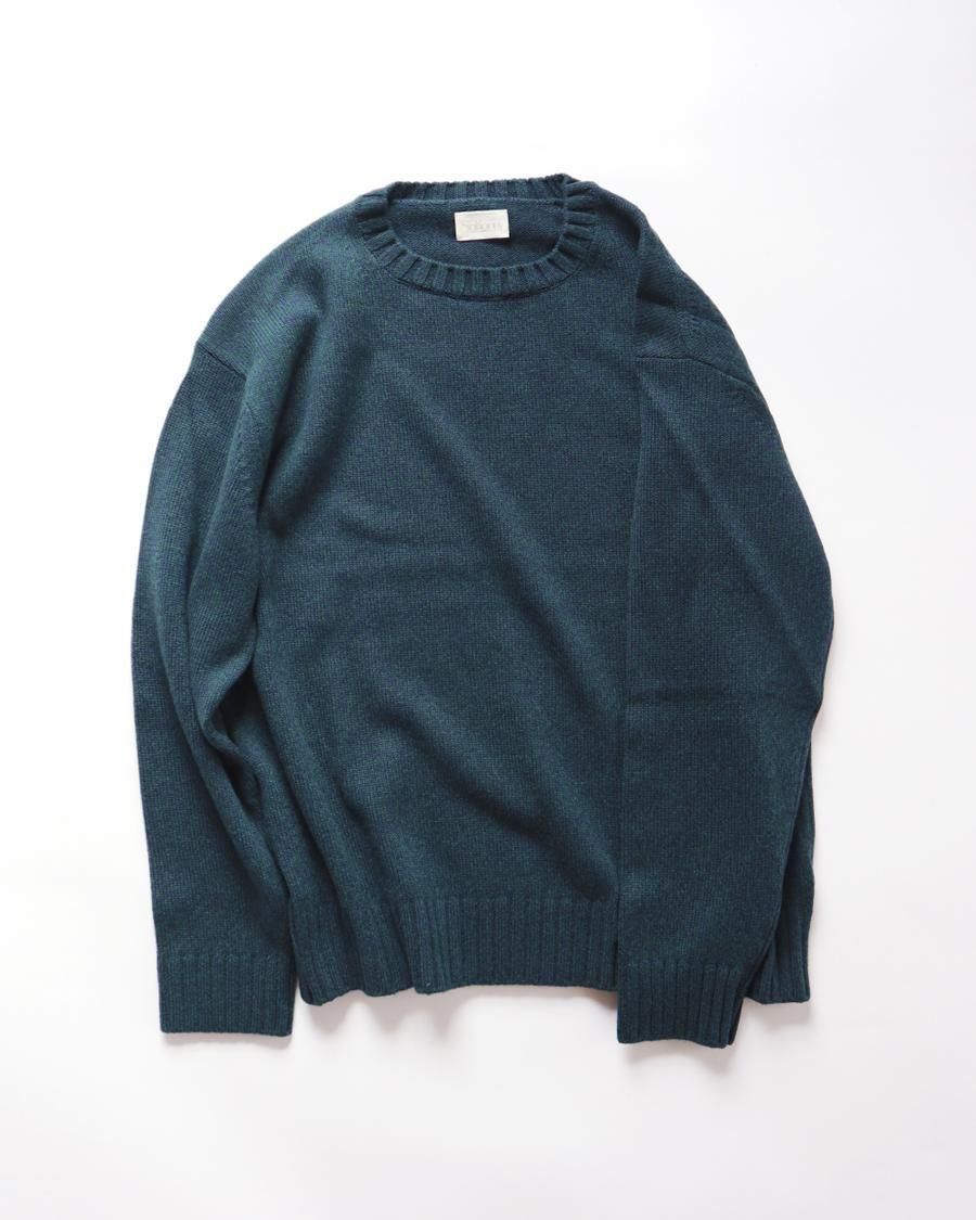 7Gのクルーネックセーターを、コットンをベースにエクストラファインラム、ホワイトカシミヤをミックスした糸で編みました。